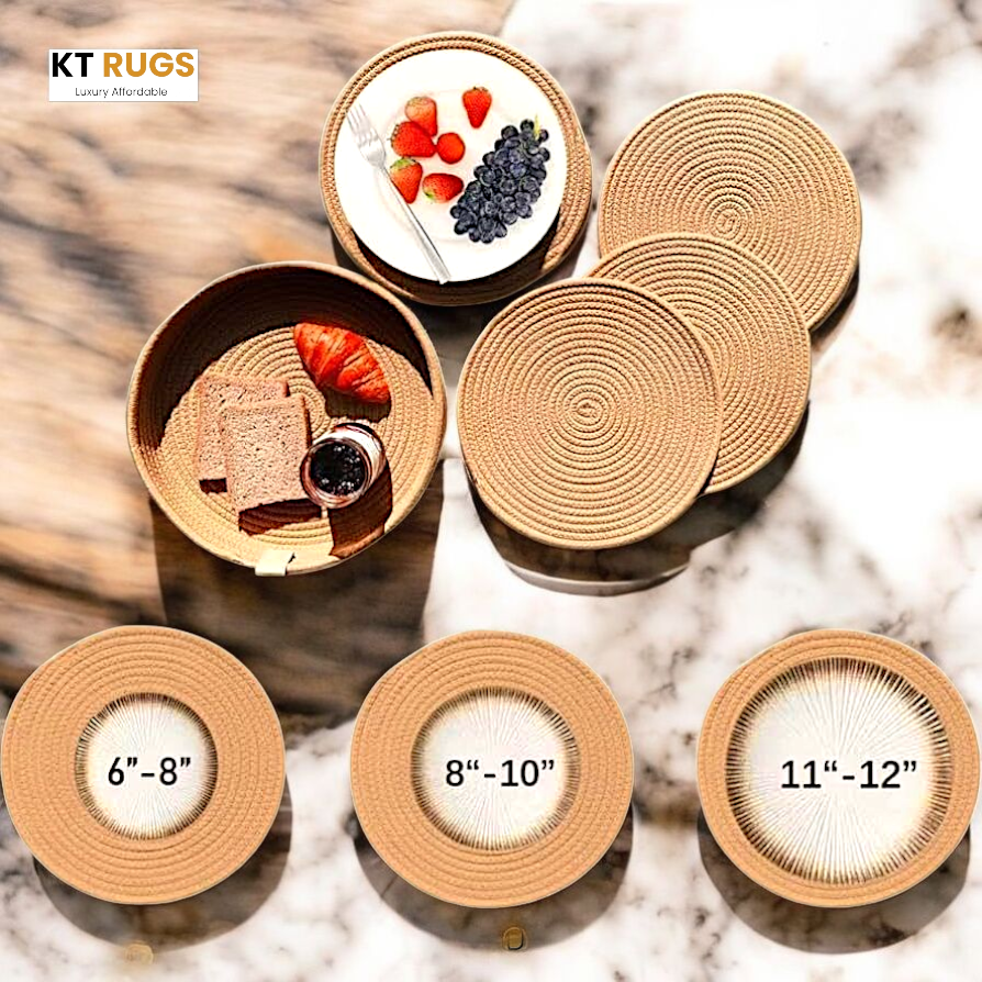 Add rustic charm to your dining table with this set of 6 handcrafted braided jute placemats in a neutral beige tone. Perfect for boho, farmhouse, and festive décor.