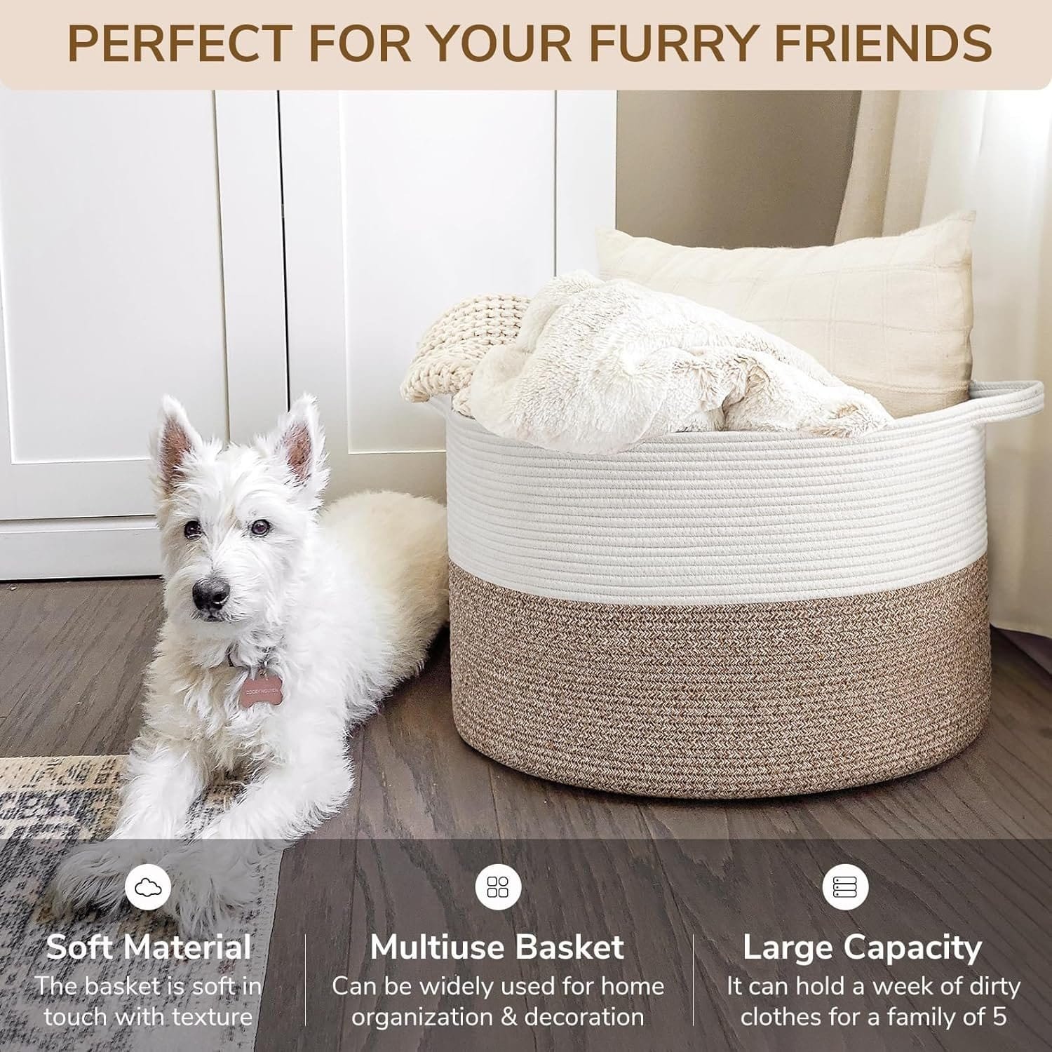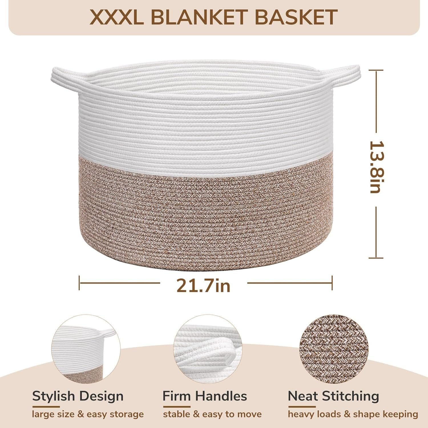 Extra Large size: 16x16x14 inches, ideal for throw pillows, blankets, comforters, or cushions. - Versatility: This exceptionally large cotton storage container or Cotton Rope Laundry Basket is perfect for storing toys, games, art/craft supplies, clothes, and more. It can be placed in the kids’ room, family room, or any room in the house that requires additional storage. It fits perfectly on a closet shelf, bookshelf, or desk.