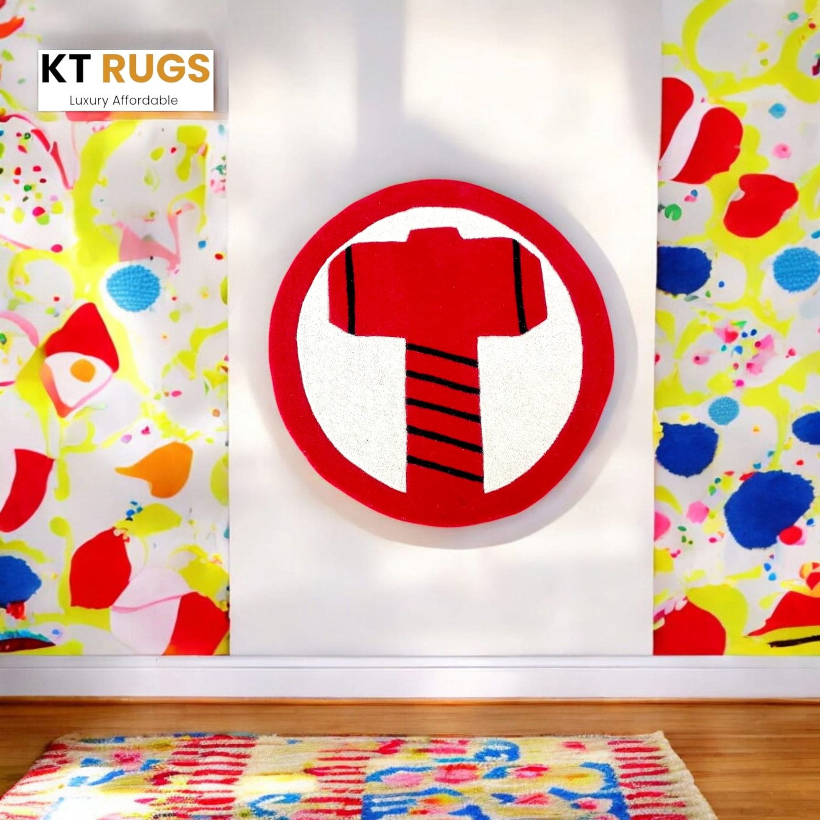 Inspired by Scandinavian minimalism and Norse symbolism, this rug transforms ancient mythology into modern art. The crimson Mjölnir represents protection and strength, while the circular form embodies harmony.