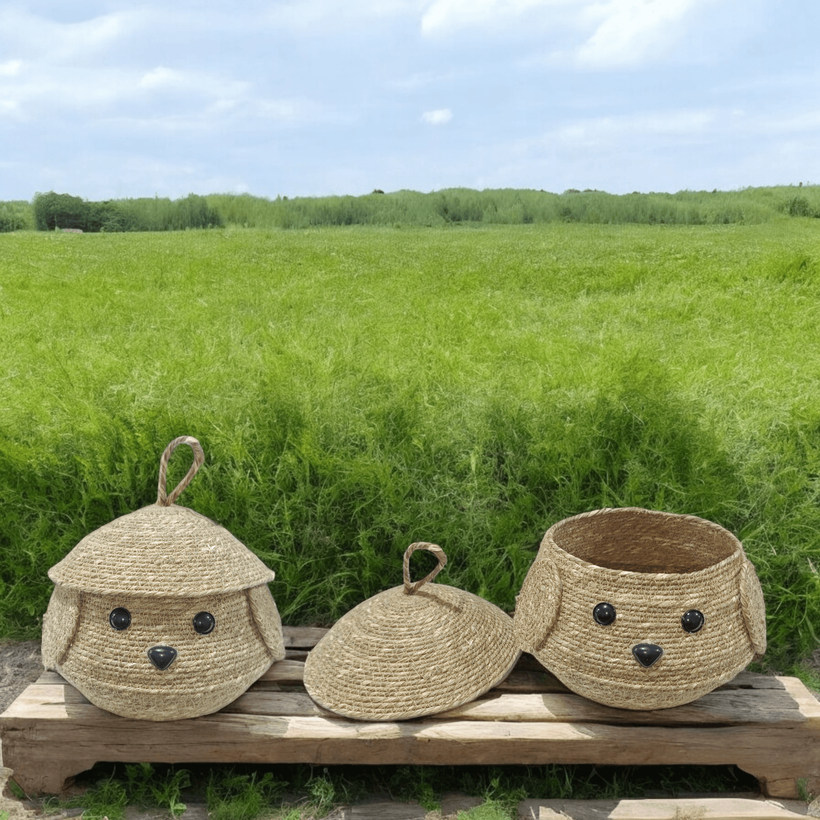 UNIQUE CARTOON DESIGN: The Cute Storage Basket Seagrass With Lid  design, combined with excellent workmanship, adds a sweet flair to the braided storage basket. The neutral color and adorable animal face design of the pet basket make it a delicate and lovely decoration for your space.