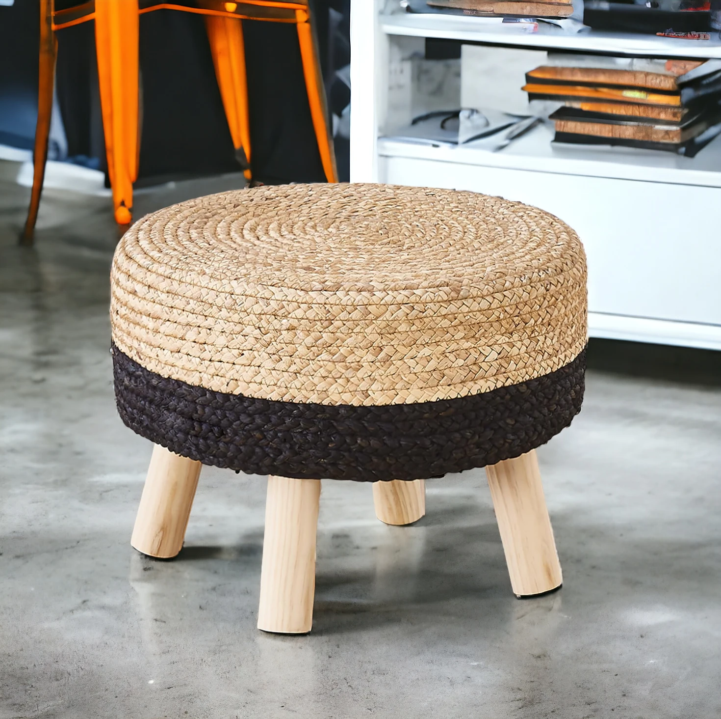 – The Pouf Ottoman is meticulously crafted by hand using a thick, sustainable, and durable Natural Water Hyacinth Braid. It is lightweight for easy movement yet sturdy and comfortable.