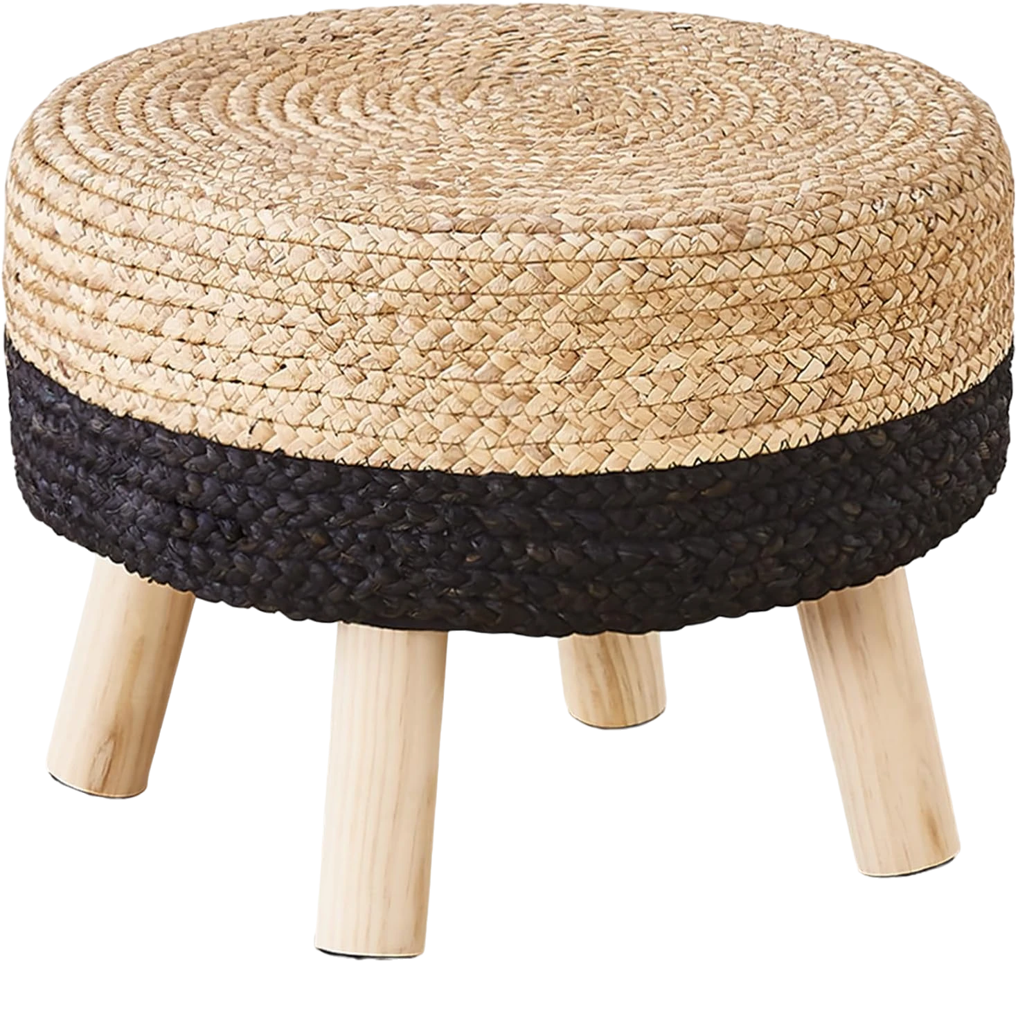 Pouf Ottoman, 17″ Round Footstool with Wood Leg, Handmade Natural Water Hyacinth Outdoor Footrest, Sofa Side Table, Accent Vanity Chair for Bedroom (Natural Water Hyacinth & Black Corn Husk)