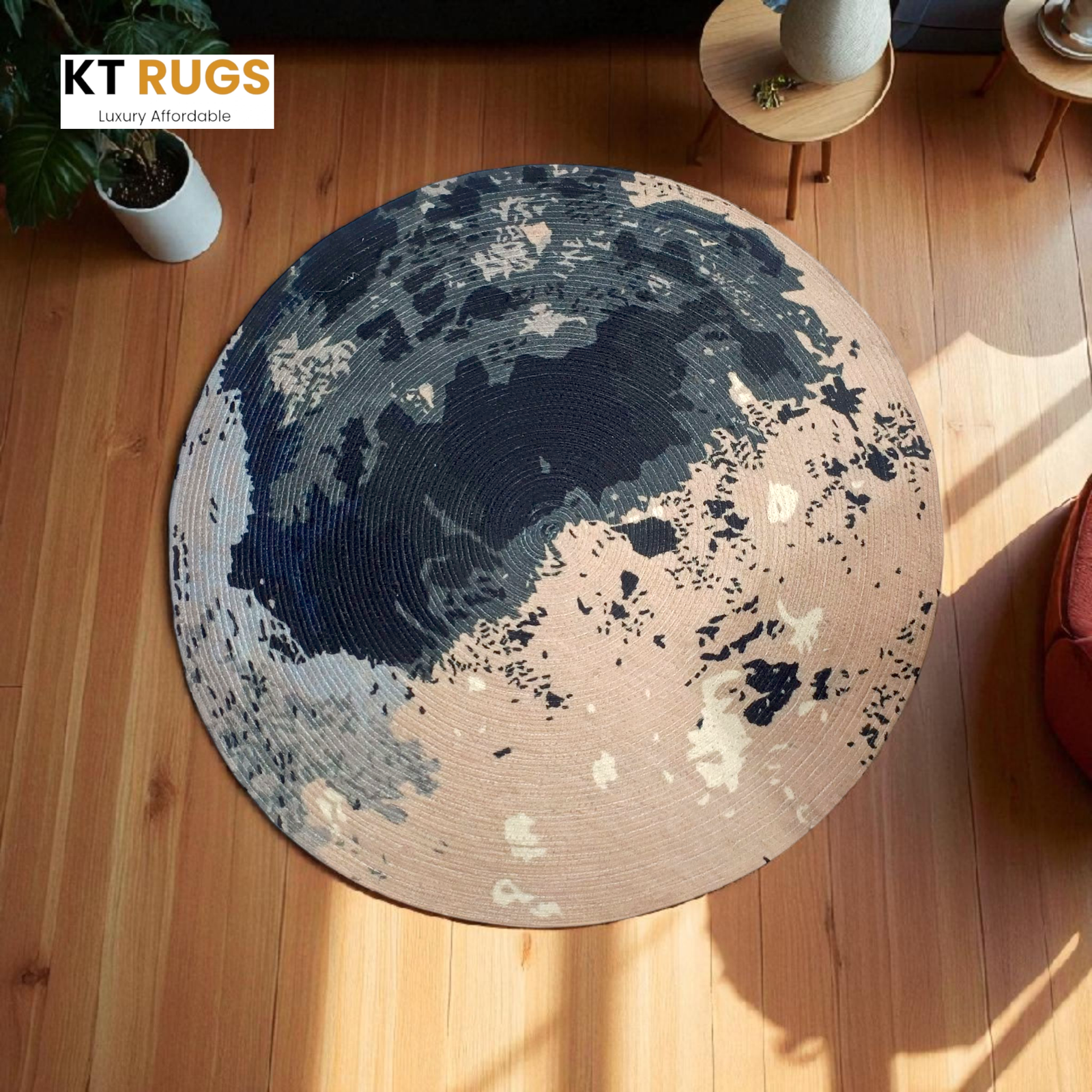 KT Rugs Luxury Affordable Round Rug – 90 cm (3 ft) – Crafted from premium polypropylene with a striking abstract splash design in blue, beige, grey, and black. Durable, stain-resistant, and perfect for adding modern elegance to living rooms, bedrooms, or offices.